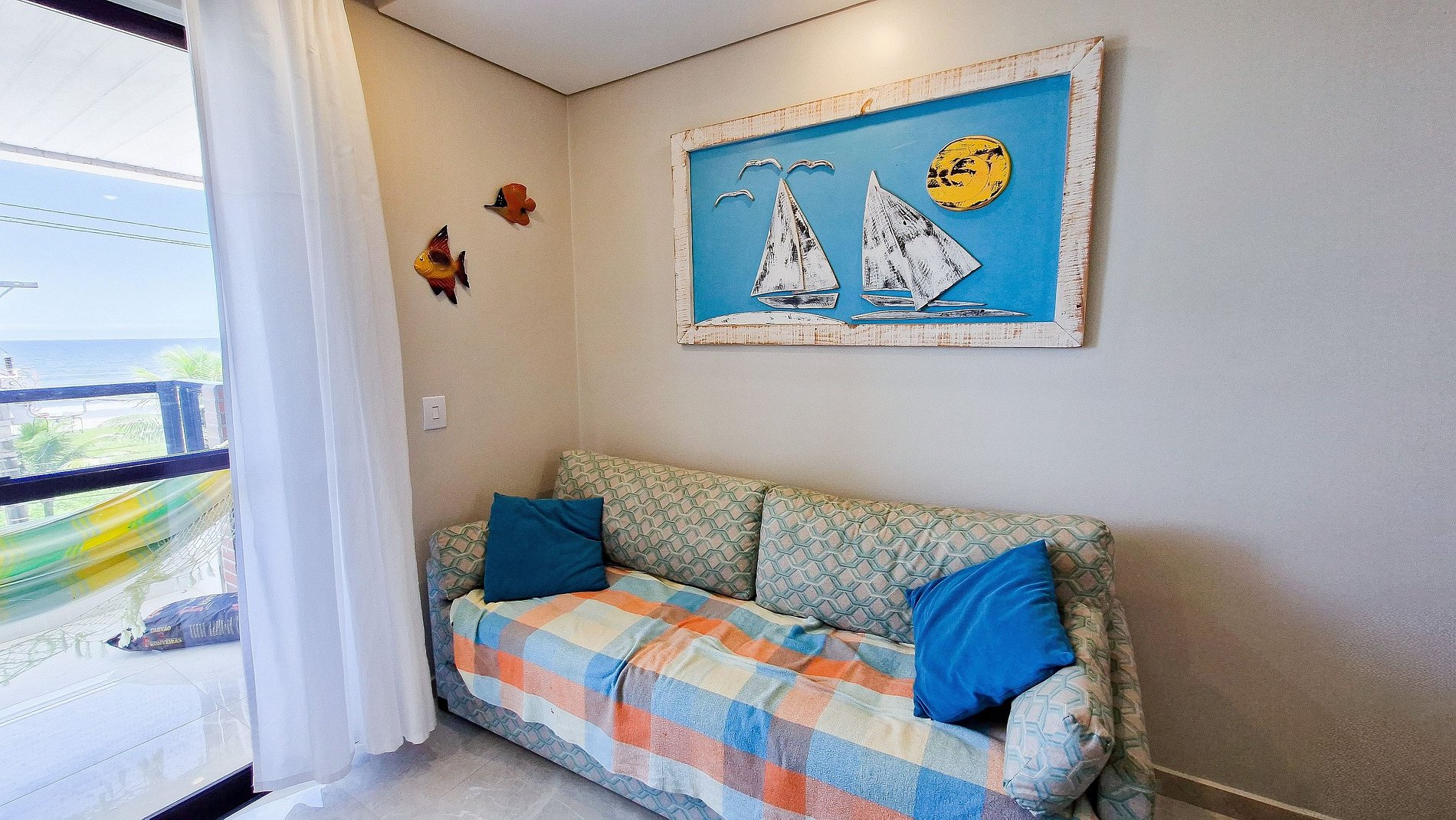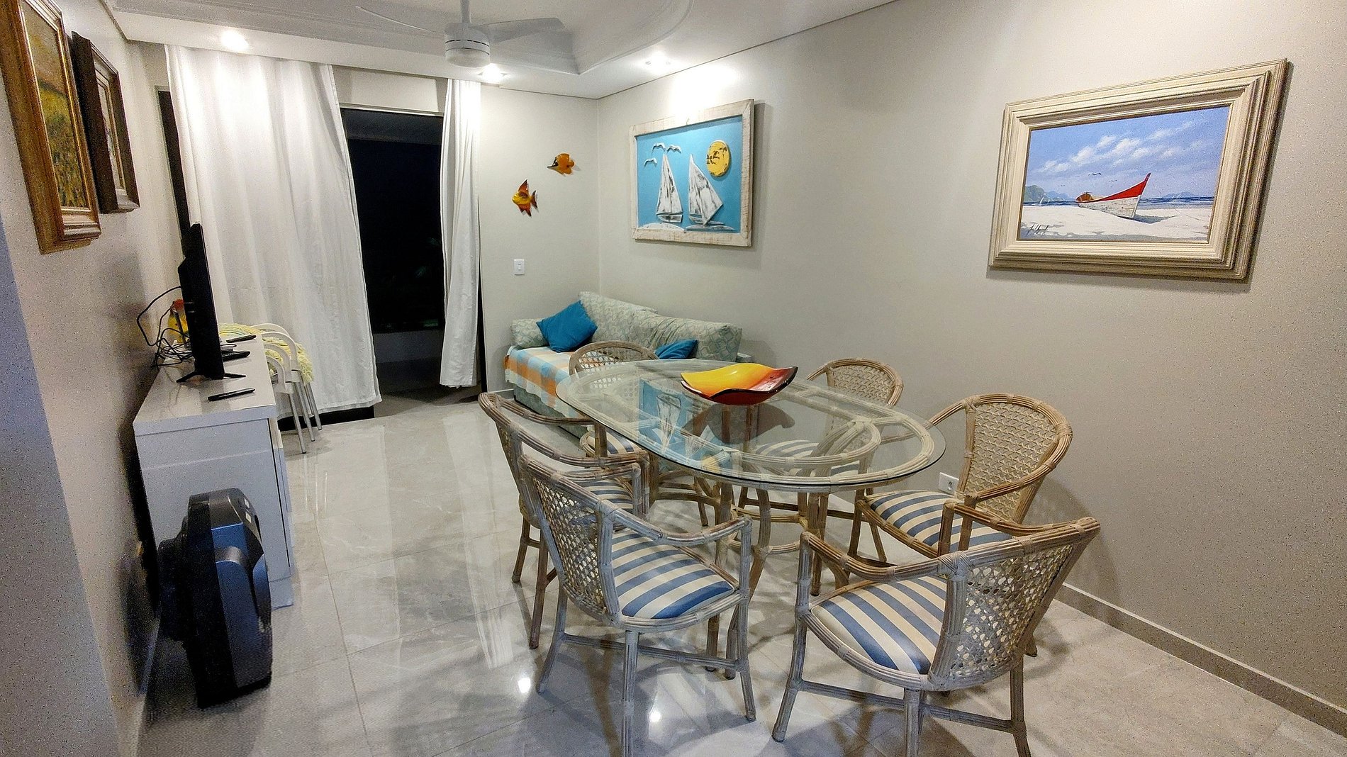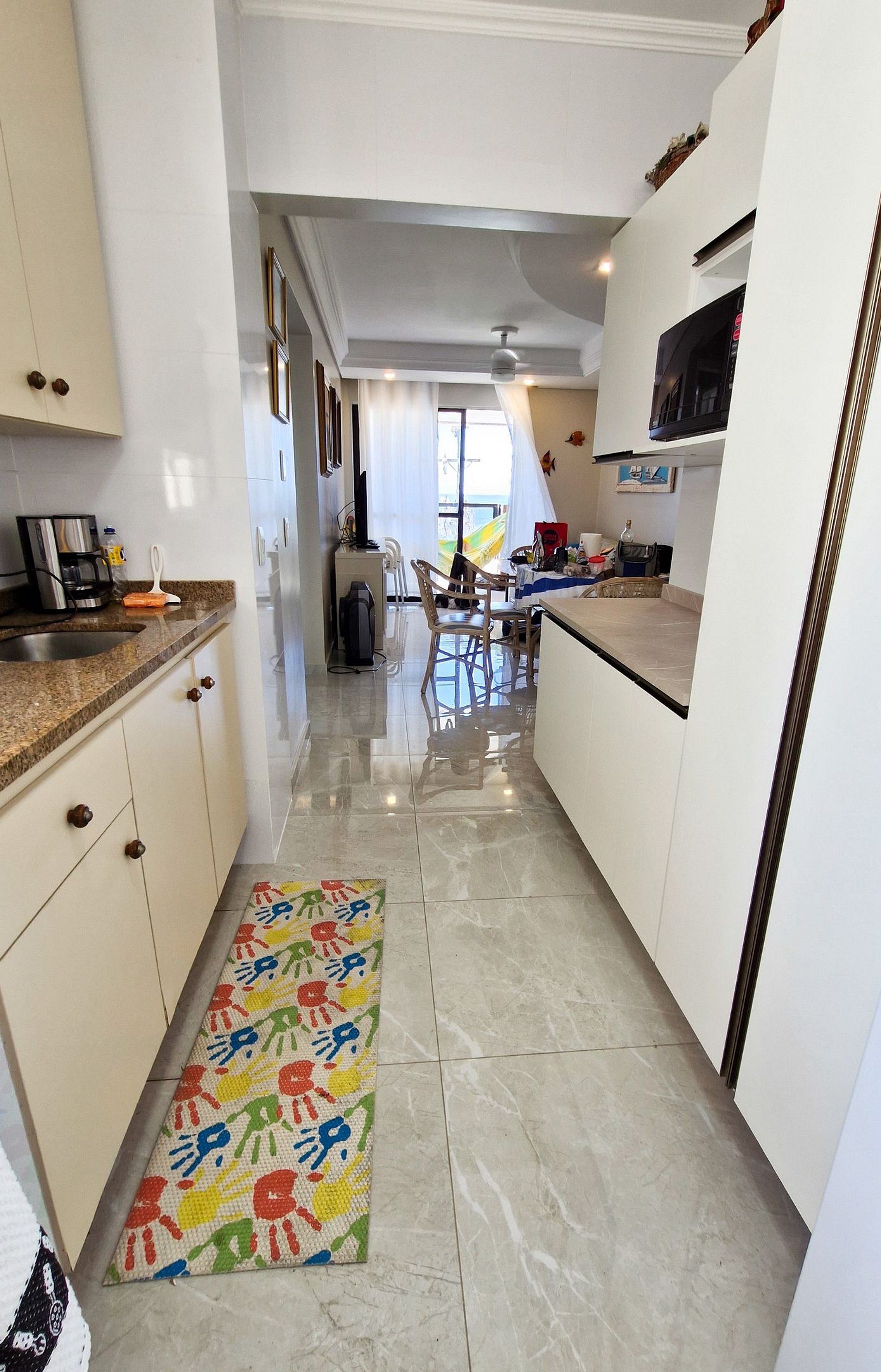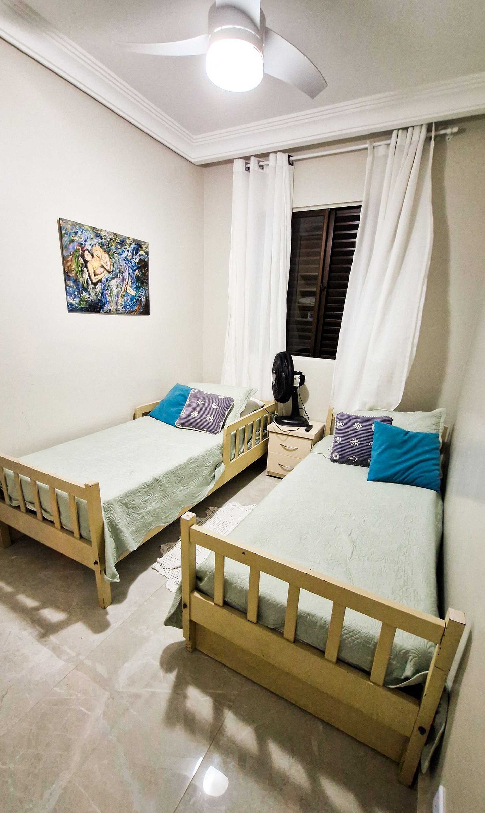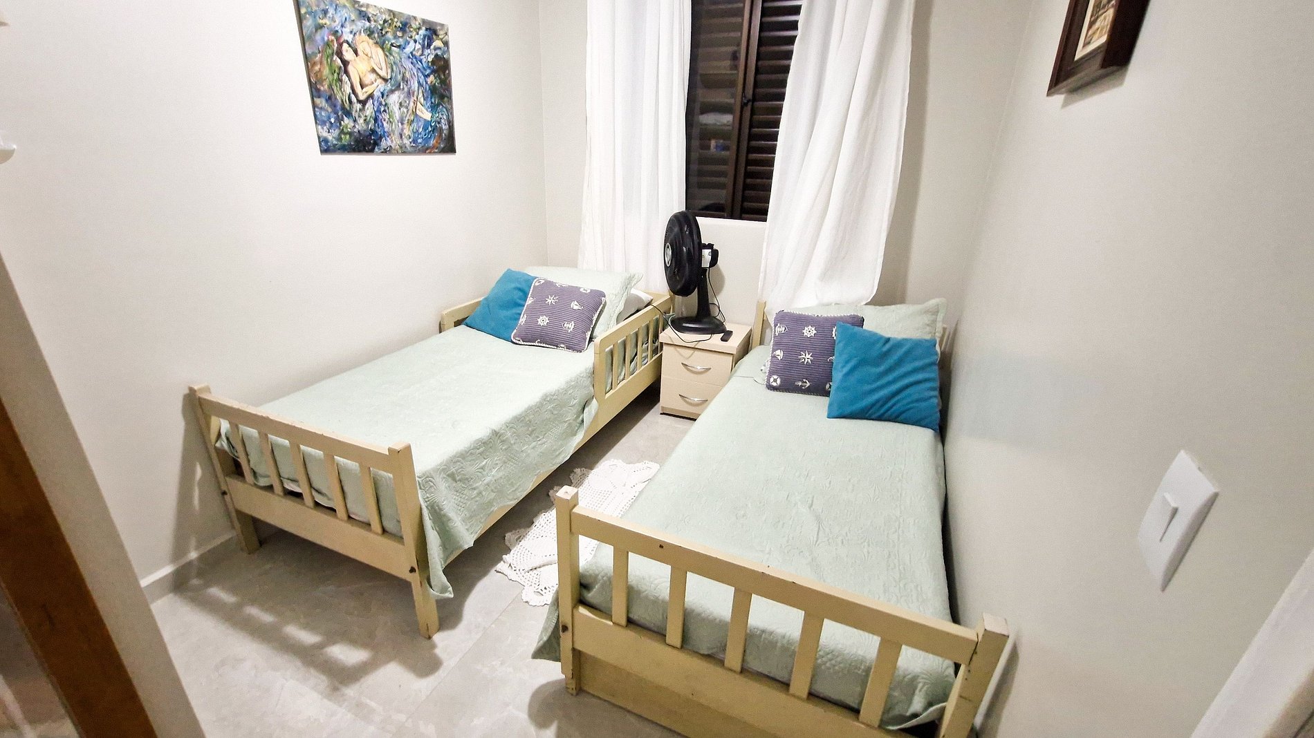 O apartamento possui dois quartos: uma suíte com sacada para o casal e um quarto com 2 camas de solteiro e uma cama auxiliar, com um outro banheiro completo ao lado. Cozinha totalmente equipada. Possui uma sala de estar e jantar conjugadas. Na sala de estar há um sofá cama de solteiro com uma cama auxiliar adicional. Há TV na sala e ventiladores disponíveis para os ambientes. Não se preocupe com itens de praia temos guarda-sol e cadeiras de praia para toda a família.